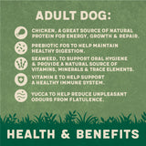 7% Dried Chicken equivalent to 28g Chicken, 5.6% Dried Rice equivalent to 14g of Rice & 1000mg/kg Dried Seaweed equivalent to 900mg of Seaweed, in every 100g kibble