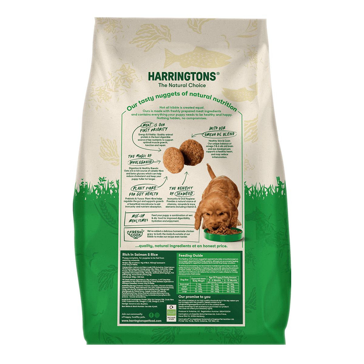 The feeding chart shows suggested approximate daily amounts (based on your dogs expected ADULT body weight), although we recommend feeding young puppies to appetite if possible. To introduce at weaning we recommend moistening with water or milk to soften the food and feeding 3 or 4 meals per day, gradually reducing the amount of liquid added, until your puppy is eating solid food. When your puppy reaches 6 months you can reduce the number of meals offered to one or two a day. Fresh drinking water should always be provided at all times. Store in a cool, dry place and fold down the top of the bag after opening.