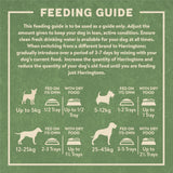 Suitable for all dogs age 8 weeks and older. This feeding guide is to be used as a guide only for a healthy adult dog with normal levels of activity. Adjust the amount given to keep your dog in lean, active condition. If feeding a puppy, adjust according to their appetite to support early development and growth. Ensure clean fresh drinking water is available for your dog at all times. When switching from a different brand to Harringtons; gradually introduce over a period of 3 to 7 days by mixing with your dog’s current food. Increase the quantity of Harringtons and reduce the quantity of your dog’s old food until you are feeding just Harringtons. Store in a cool dry place. After opening keep unused contents in a sealed container. Keep refrigerated & use within 72 hours.