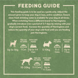 Suitable for all dogs age 8 weeks and older. This feeding guide is to be used as a guide only for a healthy adult dog with normal levels of activity. Adjust the amount given to keep your dog in lean, active condition. If feeding a puppy, adjust according to their appetite to support early development and growth. Ensure clean fresh drinking water is available for your dog at all times. When switching from a different brand to Harringtons; gradually introduce over a period of 3 to 7 days by mixing with your dog’s current food. Increase the quantity of Harringtons and reduce the quantity of your dog’s old food until you are feeding just Harringtons. Store in a cool dry place. After opening keep unused contents in a sealed container. Keep refrigerated & use within 72 hours.